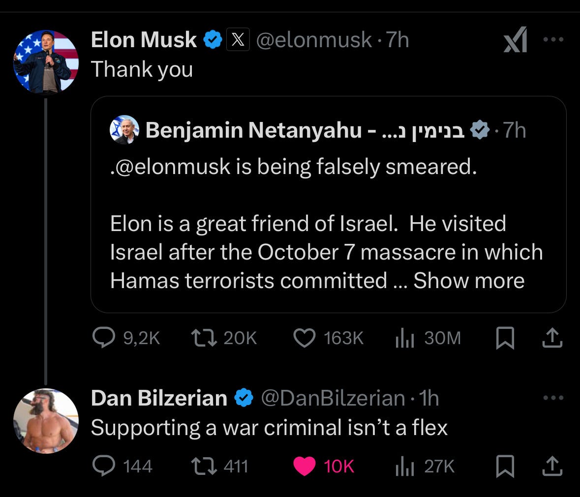 The enormous view counts of his tweets, despite weak engagement, reveal how he uses his platform to force people to see his content, even if there is no genuine acceptance of it. In this context, his public support for Israel and his thanks to Benjamin Netanyahu can be understood as an attempt to reshape public perception in their favor, disregarding the reality of ongoing atrocities. The world is becoming increasingly aware of Israel’s racism and oppression, yet Musk seeks to reframe these truths through his platform’s sheer power.
